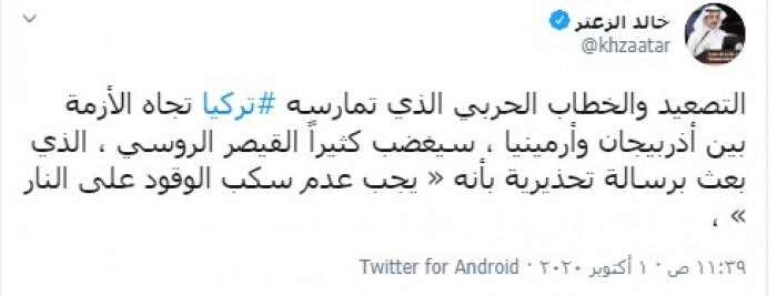 وكتب "الزعتر" تغريدة بتويتر، رصدها "المشهد العربي": "التصعيد والخطاب الحربي الذي تمارسه تركيا تجاه الأزمة بين أذربيجان وأرمينيا ، سيغضب كثيراً القيصر الروسي ، الذي بعث برسالة تحذيرية بأنه: يجب عدم سكب الوقود على النار".