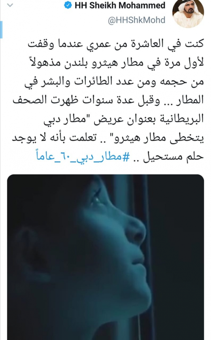 وقال بن راشد في تغريدة له عبر حسابه بتويتر ورصدها "المشهد العربي": كنت في العاشرة من عمري عندما وقفت لأول مرة في مطار هيثرو بلندن مذهولاً من حجمه ومن عدد الطائرات والبشر في المطار.
