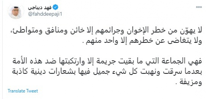 وقال في تغريدة عبر "تويتر" رصدها "المشهد العربي": "لا يهوّن من خطر الإخوان وجرائمهم إلا خائن ومنافق ومتواطئ، ولا يتغاضى عن خطرهم إلا واحد منهم".