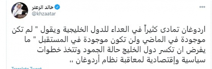 وقال في تغريدة عبر "تويتر" رصدها "المشهد العربي": "أردوغان تمادى كثيراً في العداء للدول الخليجية ويقول لم تكن موجودة في الماضي ولن تكون موجودة في المستقبل ما يفرض أن تكسر دول الخليج حالة الجمود وتتخذ خطوات سياسية واقتصادية لمعاقبة نظام أردوغان".