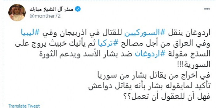 انتقد المدون السعودي البارز منذر آل الشيخ مبارك، اليوم، المؤيدين لمخططات الرئيس التركي رجب طيب أردوغان في المنطقة.