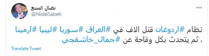 هاجم المحلل السياسي اللبناني نضال السبع، اليوم، النظام التركي، مؤكدًا أنه قتل الآلاف في العراق وسوريا وليبيا وأرمينيا.