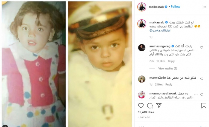غازلت الفنانة مي كساب زوجها مطرب المهرجانات "أوكا"، من خلال نشر صورة لهما في مرحلة الطفولة ظهرت خلالها ترتدي فستانًا بينما يرتدي هو بدلة ضابط شرطة.