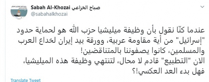 وكتب في تغريدة عبر "تويتر" رصدها "المشهد العربي": "عندما كنّا نقول بأن وظيفة ميليشيا حزب الله هو لحماية حدود إسرائيل من أية مقاومة عربية، وورقة بيد إيران لخداع العرب والمسلمين، كانوا يصفوننا بالمتناقضين".