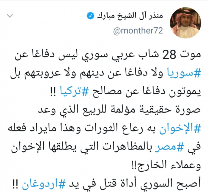 وكتب المبارك عبر تغريدة له على "تويتر" رصدها " المشهد العربي": "موت 28 شاب عربي سوري ليس دفاعًا عن سوريا ولا دفاعًا عن دينهم ولا عروبتهم بل يموتون دفاعًا عن مصالح تركيا".