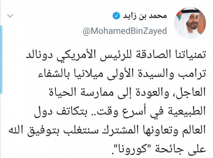 تضامن ولى عهد أبوظبى نائب القائد الأعلى للقوات المسلحة الإماراتية الشيخ محمد بن زايد آل نهيان، مع إصابة الرئيس الأمريكي دونالد ترامب وزوجته بفيروس كورونا، متمنيا له الشفاء العاجل.