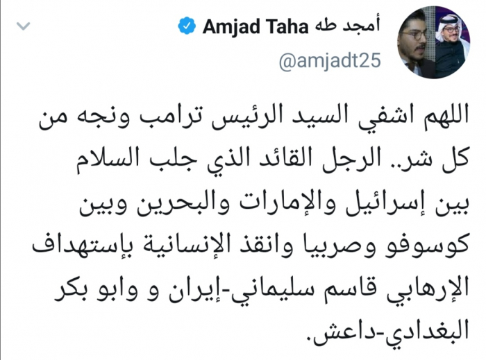 دعا الرئيس الإقليمي للمركز البريطاني لدراسات الشرق الأوسط أمجد طه، بالشفاء للرئيس الأمريكي دونالد ترامب من فيروس كورونا ووصفه بمنقذ الإنسانية.