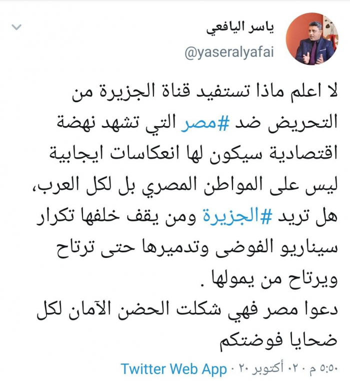 وقال اليافعي عبر تغريدة له على "تويتر" رصدها " المشهد العربي": "لا أعلم ماذا تستفيد قناة الجزيرة من التحريض ضد مصر التي تشهد نهضة اقتصادية".