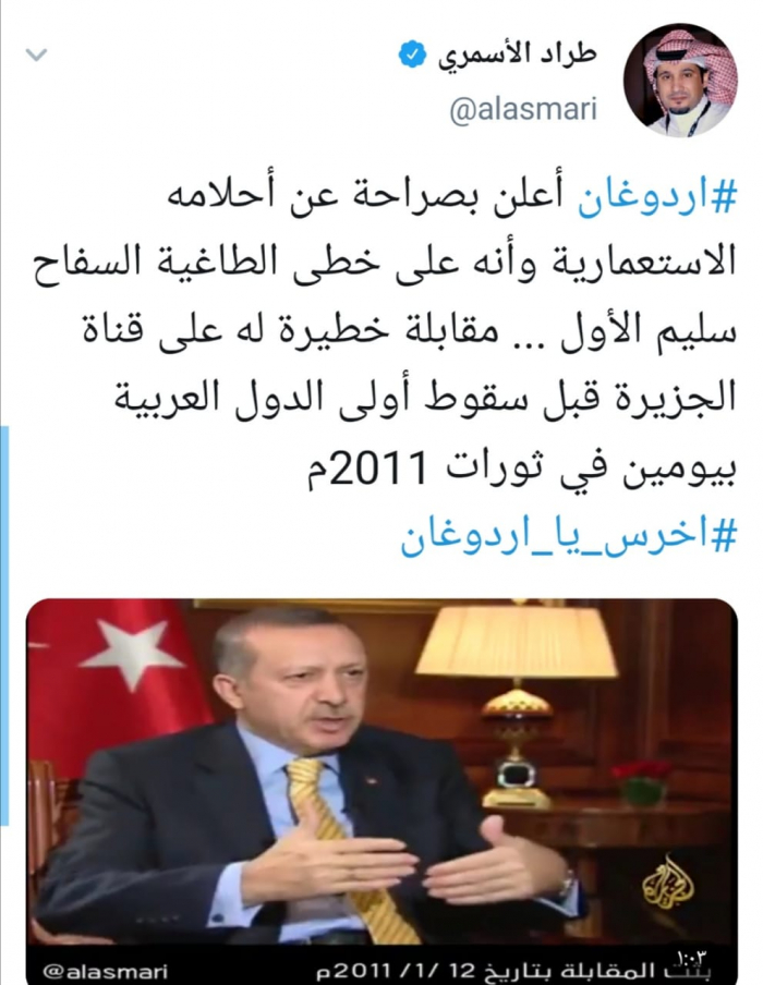 وغرد الأسمري في حسابه على تويتر ورصدها "المشهد العربي": "أردوغان أعلن بصراحة عن أحلامه الاستعمارية وأنه على خطى الطاغية السفاح سليم الأول".