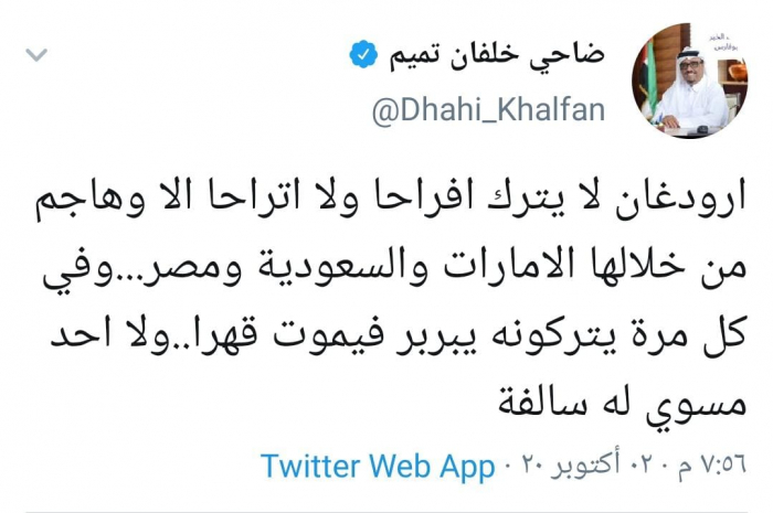 وكتب خلفان عبر تغريدة له على "تويتر" رصدها " المشهد العربي": "أردوغان لا يترك أفراحا ولا اتراحا إلا وهاجم من خلالها الإمارات والسعودية ومصر".