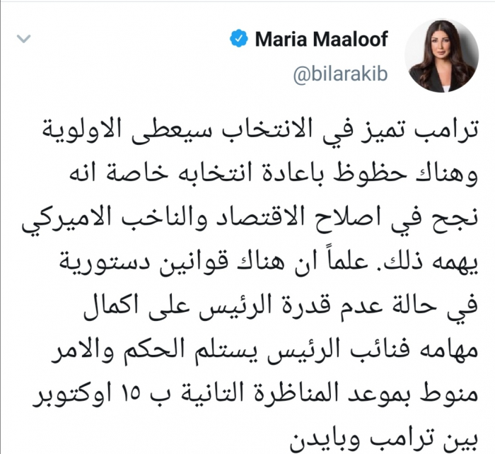 وأشارت معلوف إلى "أن هناك قوانين دستورية في حالة عدم قدرة الرئيس على إكمال مهامه فنائب الرئيس يستلم الحكم والأمر منوط بموعد المناظرة التانية ب ١٥ أكتوبر بين ترامب وبايدن".