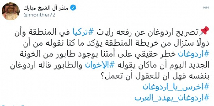 اعتبر المدون السعودي البارز منذر آل الشيخ مبارك، اليوم، أن الرئيس التركي رجب طيب أردوغان خطر حقيقي على الأمة العربية.