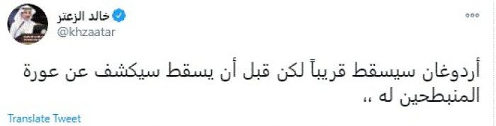 وقال في تغريدة عبر "تويتر" رصدها "المشهد العربي": "أردوغان سيسقط قريباً لكن قبل أن يسقط سيكشف عن عورة المنبطحين له".