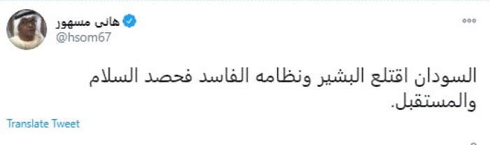 وكتب في تغريدة عبر "تويتر" رصدها "المشهد العربي": "السودان اقتلع البشير ونظامه الفاسد فحصد السلام والمستقبل".