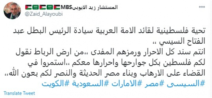 وقال في تغريدة عبر "تويتر" رصدها "المشهد العربي": "تحية فلسطينية لقائد الأمة العربية سيادة الرئيس البطل عبد الفتاح السيسي،، أنتم سند كل الأحرار ورمزهم المفدى،، من أرض الرباط نقول لكم فلسطين بكل جوارحها وأحرارها معكم،، استمروا في القضاء على الإرهاب وبناء مصر الحديثة والنصر لكم بعون الله".