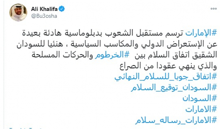 وكتب في تغريدة عبر "تويتر" رصدها "المشهد العربي": "الإمارات ترسم مستقبل الشعوب بدبلوماسية هادئة بعيدة عن الاستعراض الدولي والمكاسب السياسية، هنئيا للسودان الشقيق اتفاق السلام بين الخرطوم والحركات المسلحة والذي ينهي عقودا من الصراع".