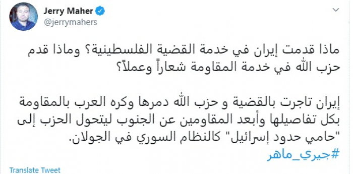 وكتب في تغريدة عبر "تويتر" رصدها "المشهد العربي": "ماذا قدمت إيران في خدمة القضية الفلسطينية؟ وماذا قدم حزب الله في خدمة المقاومة شعاراً وعملاً؟".