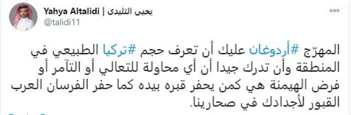 وقال في تغريدة عبر "تويتر" رصدها "المشهد العربي": "المهرّج أردوغان عليك أن تعرف حجم تركيا الطبيعي في المنطقة وأن تدرك جيدا أن أي محاولة للتعالي أو التآمر أو فرض الهيمنة هي كمن يحفر قبره بيده كما حفر الفرسان العرب القبور لأجدادك في صحارينا".
