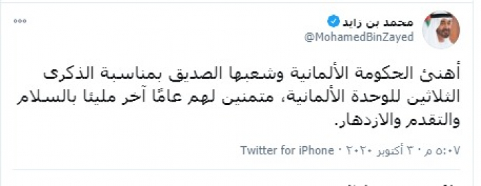وكتب "بن زايد" تغريدة عبر تويتر، رصدها "المشهد العربي": "أهنئ الحكومة الألمانية وشعبها الصديق بمناسبة الذكرى الثلاثين للوحدة الألمانية، متمنين لهم عامًا آخر مليئا بالسلام والتقدم والازدهار".