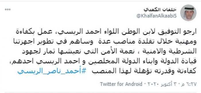 وكتب "الكعبي" تغريدة عبر تويتر، رصدها "المشهد العربي": "أرجو التوفيق لابن الوطن اللواء أحمد الريسي".