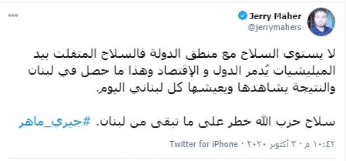 وكتب "ماهر" في تغريدة عبر تويتر، رصدها "المشهد العربي": "لا يستوي السلاح مع منطق الدولة فالسلاح المتفلت بيد الميليشيات يُدمر الدول و الإقتصاد وهذا ما حصل في لبنان والنتيجة يشاهدها ويعيشها كل لبناني اليوم".