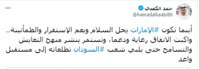 وكتب "الكعبي" تغريدة عبر تويتر، رصدها "المشهد العربي": "أينما تكون الإمارات يحل السلام ويعم الاستقرار والطمأنينة".