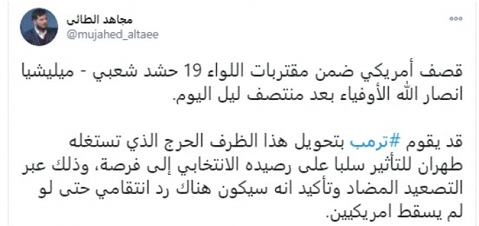 وقال في تغريدة عبر "تويتر" رصدها "المشهد العربي": "قصف أمريكي ضمن مقتربات اللواء 19 حشد شعبي - ميليشيا أنصار الله الأوفياء بعد منتصف ليل اليوم. قد يقوم ترمب بتحويل هذا الظرف الحرج الذي تستغله طهران للتأثير سلبا على رصيده الانتخابي إلى فرصة، وذلك عبر التصعيد المضاد وتأكيد أنه سيكون هناك رد انتقامي حتى لو لم يسقط أمريكيين".