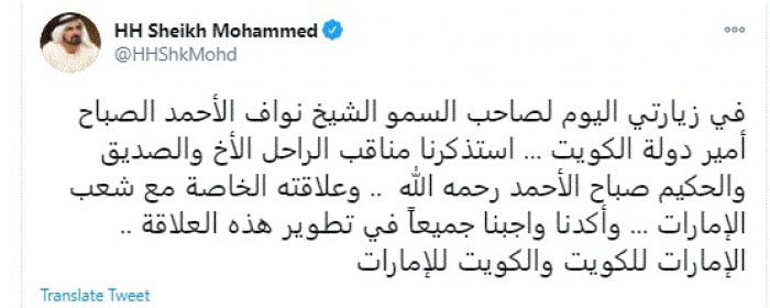 وقال في تغريدة عبر "تويتر" رصدها "المشهد العربي": "في زيارتي اليوم لصاحب السمو الشيخ نواف الأحمد الصباح أمير دولة الكويت استذكرنا مناقب الراحل الأخ والصديق والحكيم صباح الأحمد رحمه الله وعلاقته الخاصة مع شعب الإمارات... وأكدنا واجبنا جميعاً في تطوير هذه العلاقة .. الإمارات للكويت والكويت للإمارات".