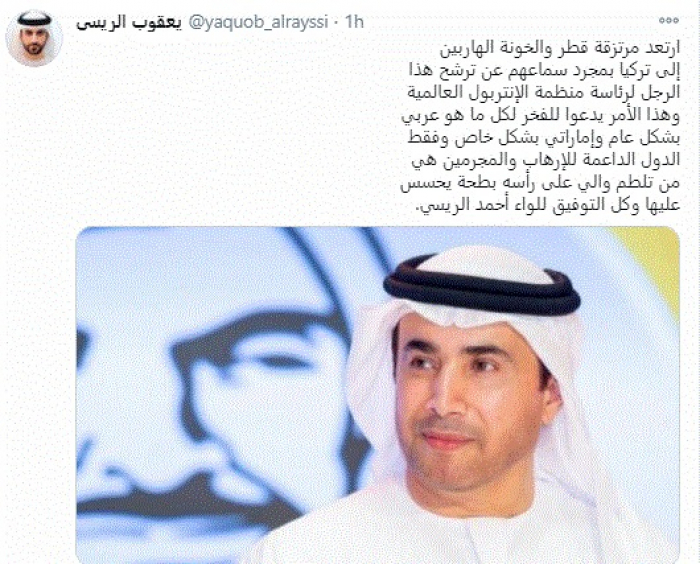 وقال في تغريدة عبر "تويتر" رصدها "المشهد العربي": "ارتعد مرتزقة قطر والخونة الهاربين إلى تركيا بمجرد سماعهم عن ترشح هذا الرجل لرئاسة منظمة الإنتربول العالمية وهذا الأمر يدعوا للفخر لكل ما هو عربي بشكل عام وإماراتي بشكل خاص وفقط الدول الداعمة للإرهاب والمجرمين هي من تلطم والي على رأسه بطحة يحسس عليها وكل التوفيق للواء أحمد الريسي".