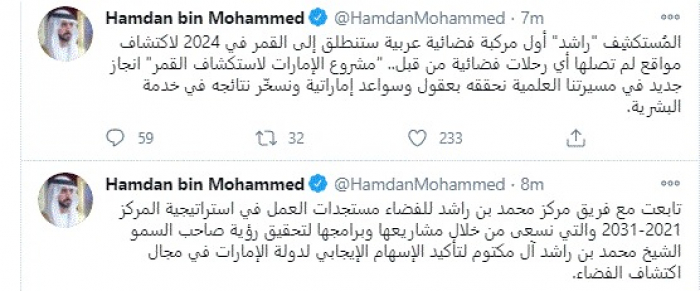 وأضاف: "المُستكشِف راشد أول مركبة فضائية عربية ستنطلق إلى القمر في 2024 لاكتشاف مواقع لم تصلها أي رحلات فضائية من قبل.. مشروع الإمارات لاستكشاف القمر انجاز جديد في مسيرتنا العلمية نحققه بعقول وسواعد إماراتية ونسخّر نتائجه في خدمة البشرية".