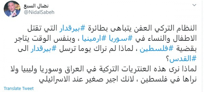 وقال في تغريدة عبر "تويتر" رصدها "المشهد العربي": "النظام التركي العفن يتباهى بطائرة بيرقدار التي تقتل الأطفال والنساء في سوريا أرمينيا، وبنفس الوقت يتاجر بقضية فلسطين، لماذا لم نراك يوما ترسل بيرقدار إلى القدس؟".
