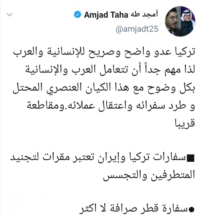 وقال طه في تغريدة له عبر حسابه بتويتر ورصدها "المشهد العربي": "تركيا عدو واضح وصريح للإنسانية والعرب لذا مهم جداً أن تتعامل العرب والإنسانية بكل وضوح مع هذا الكيان العنصري المحتل و طرد سفرائه واعتقال عملائه ومقاطعة قريبا".