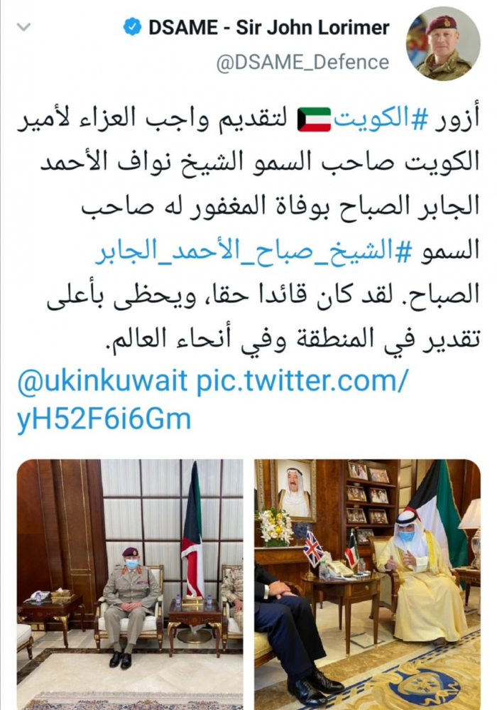 أعلن السفير سير جون لوريمر، كبير مستشاري الدفاع لشؤون الشرق الأوسط وشمال أفريقيا، توجهه للكويت لتقديم واجب العزاء لأمير الكويت الشيخ نواف الأحمد الجابر الصباح في وفاة الشيخ صباح الأحمد الجابر الصباح.