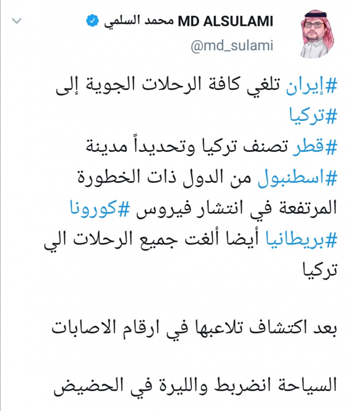 وغرد السلمي عبر حسابه بتويتر ورصدها "المشهد العربي": "إيران تلغي كافة الرحلات الجوية إلى تركيا، قطر تصنف تركيا وتحديداً مدينة اسطنبول من الدول ذات الخطورة المرتفعة في انتشار فيروس كورونا، بريطانيا أيضا ألغت جميع الرحلات إلى تركيا".