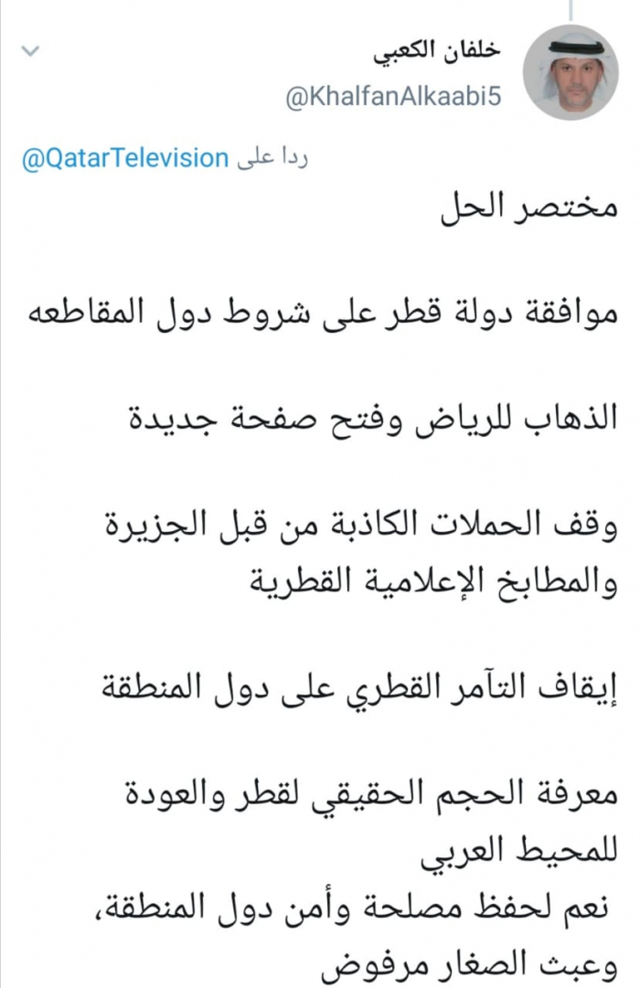 وأضاف الكعبي من بين شروطه: "الذهاب للرياض وفتح صفحة جديدة، ووقف الحملات الكاذبة من قبل الجزيرة والمطابخ الإعلامية القطرية، وإيقاف التآمر القطري على دول المنطقة".