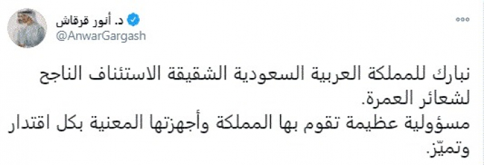 هنأ وزير الدولة الإماراتي للشؤون الخارجية الدكتور أنور قرقاش، اليوم، المملكة العربية السعودية جراء استئناف شعائر العمرة من جديد.