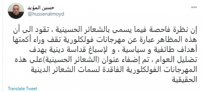 وكتب في تغريدة عبر "تويتر" رصدها "المشهد العربي": "إن نظرة فاحصة فيما يسمى بالشعائر الحسينية، تقود الى أن هذه المظاهر عبارة عن مهرجانات فولكلورية تقف وراء أكمتها أهداف طائفية وسياسية، ولإسباغ قداسة دينية بهدف تضليل العوام، تم إضفاء عنوان (الشعائر الحسينية) على هذه المهرجانات الفولكلورية الفاقدة لسمات الشعائر الدينية الحقيقية".