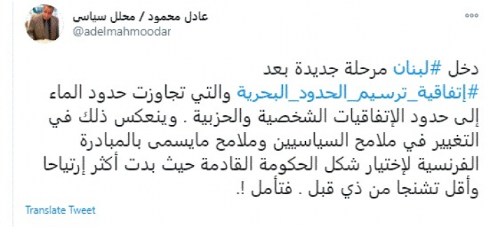 وكتب في تغريدة عبر "تويتر" رصدها "المشهد العربي": "دخل لبنان مرحلة جديدة بعد اتفاقية ترسيم الحدود البحرية والتي تجاوزت حدود الماء إلى حدود الإتفاقيات الشخصية والحزبية".