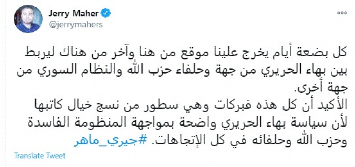 وكتب في تغريدة عبر "تويتر" رصدها "المشهد العربي": "كل بضعة أيام يخرج علينا موقع من هنا وآخر من هناك ليربط بين بهاء الحريري من جهة وحلفاء حزب الله والنظام السوري من جهة أخرى".
