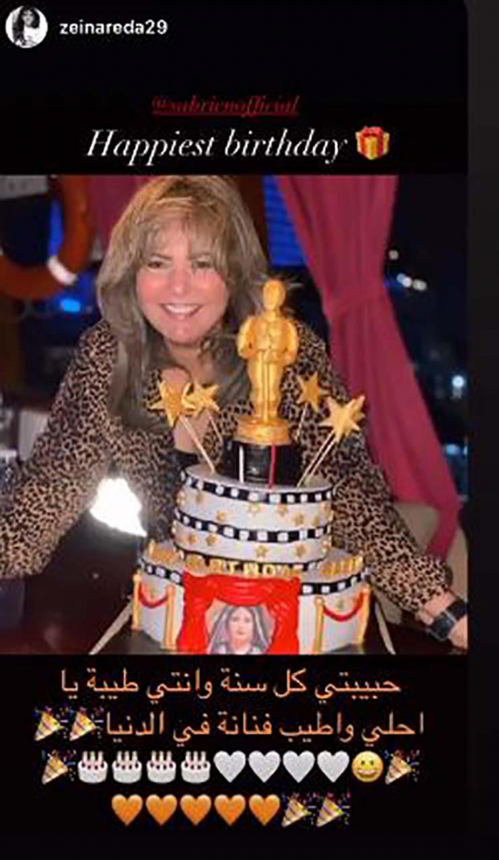 الصورة ظهرت فيها صابرين بإطلالة جديدة، أمام "تورتة" عيد الميلاد، معلقة :"أوسكار عيد ميلادي هدية من أولادي".
