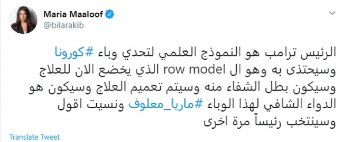 وكتبت في تغريدة عبر "تويتر" رصدها "المشهد العربي": "الرئيس ترامب هو النموذج العلمي لتحدي وباء كورونا وسيحتذى به وهو ال row model الذي يخضع الآن للعلاج وسيكون بطل الشفاء منه وسيتم تعميم العلاج وسيكون هو الدواء الشافي لهذا الوباء ماريا معلوف ونسيت أقول وسينتخب رئيساً مرة أخرى".