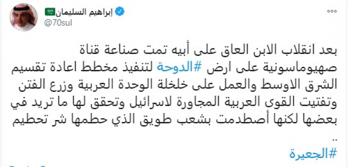 وقال في تغريدة عبر "تويتر" رصدها "المشهد العربي": "بعد انقلاب الابن العاق على أبيه تمت صناعة قناة صهيوماسونية على أرض الدوحة لتنفيذ مخطط إعادة تقسيم الشرق الأوسط والعمل على خلخلة الوحدة العربية وزرع الفتن وتفتيت القوى العربية المجاورة لإسرائيل وتحقق لها ما تريد في بعضها لكنها اصطدمت بشعب طويق الذي حطمها شر تحطيم".