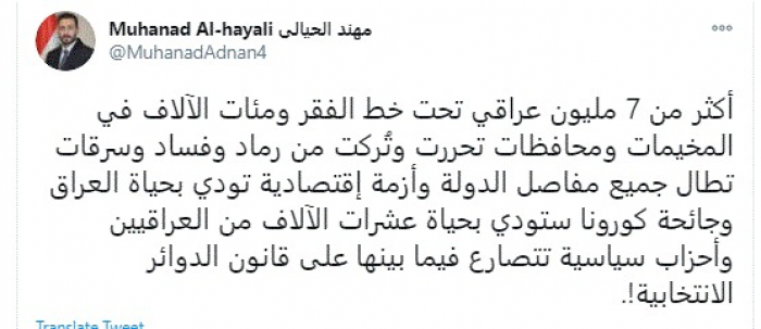 وقال في تغريدة عبر "تويتر" رصدها "المشهد العربي": "أكثر من 7 مليون عراقي تحت خط الفقر ومئات الآلاف في المخيمات ومحافظات تحررت وتُركت من رماد وفساد وسرقات تطال جميع مفاصل الدولة وأزمة اقتصادية تودي بحياة العراق وجائحة كورونا ستودي بحياة عشرات الآلاف من العراقيين وأحزاب سياسية تتصارع فيما بينها على قانون الدوائر الانتخابية".
