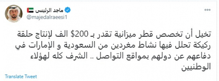 هاجم الكاتب الإماراتي ماجد الرئيسي، اليوم، النظام القطري، جراء الأموال التي يخصصها لترويج الأكاذيب عبر قناة الجزيرة القطرية.
