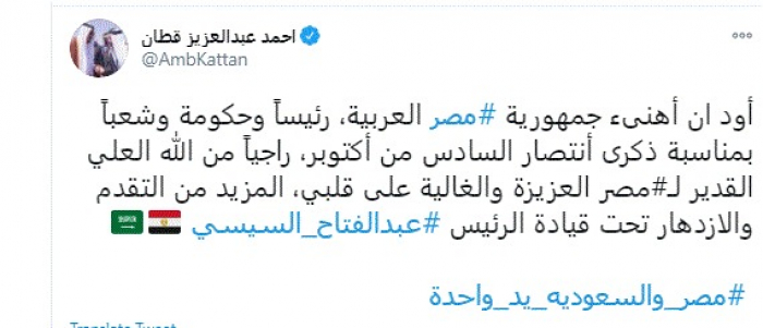 القطان عن ذكرى انتصار أكتوبر: مصر والسعودية يد واحدة