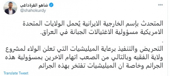 وقال في تغريدة عبر "تويتر" رصدها "المشهد العربي": "المتحدث بإسم الخارجية الايرانية يُحمل الولايات المتحدة الأمريكية مسؤولية الاغتيالات الجبانة في العراق. التحريض والتنفيذ برعاية الميليشيات التي تعلن الولاء لمشروع ولاية الفقيه وبالتالي من الصعب اتهام الاخرين بمسؤولية هذه الجرائم وخاصة أن الميليشيات تفتخر بهذه الجرائم".