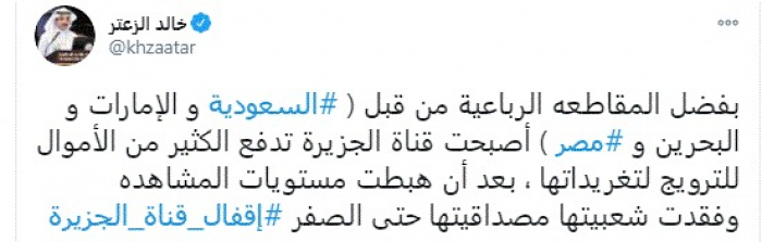 وكتب في تغريدة عبر "تويتر" رصدها "المشهد العربي": "بفضل المقاطعة الرباعية من قبل (السعودية والإمارات والبحرين ومصر) أصبحت قناة الجزيرة تدفع الكثير من الأموال للترويج لتغريداتها، بعد أن هبطت مستويات المشاهدة وفقدت شعبيتها مصداقيتها حتى الصفر إقفال قناة الجزيرة".