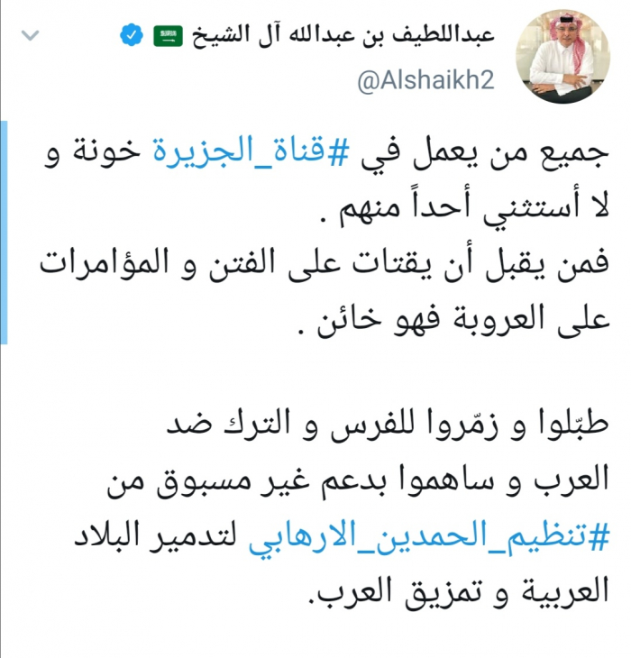 وقال آل الشيخ في تغريدة له عبر حسابه بتويتر ورصدها "المشهد العربي": "جميع من يعمل في قناة الجزيرة خونة ولا استثني أحداً منهم".