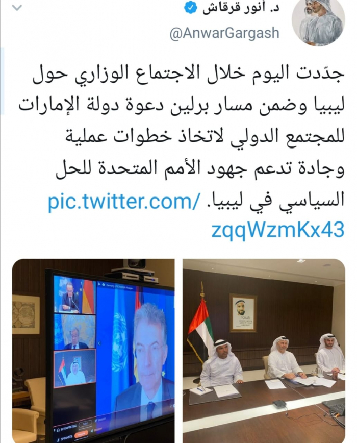 وكتب قرقاش عبر حسابه بتويتر ورصدها "المشهد العربي": "جدّدت اليوم خلال الاجتماع الوزاري حول ليبيا وضمن مسار برلين دعوة دولة الإمارات للمجتمع الدولي لاتخاذ خطوات عملية وجادة تدعم جهود الأمم المتحدة للحل السياسي في ليبيا".