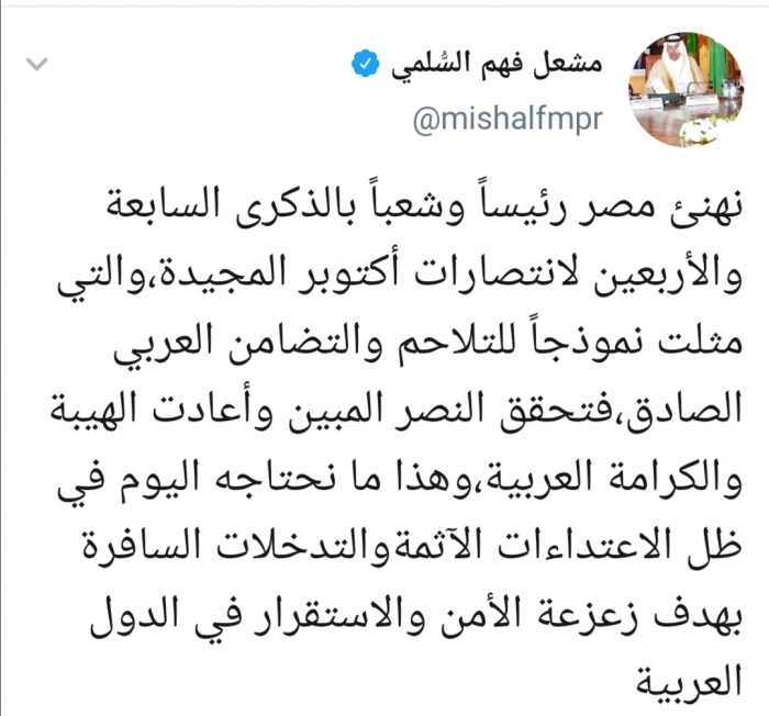 وكتب السلمي عبر تغريدة له على "تويتر" رصدها "المشهد العربي": "نهنئ مصر رئيساً وشعباً بالذكرى السابعة والأربعين لانتصارات أكتوبر المجيدة،والتي مثلت نموذجاً للتلاحم والتضامن العربي الصادق".